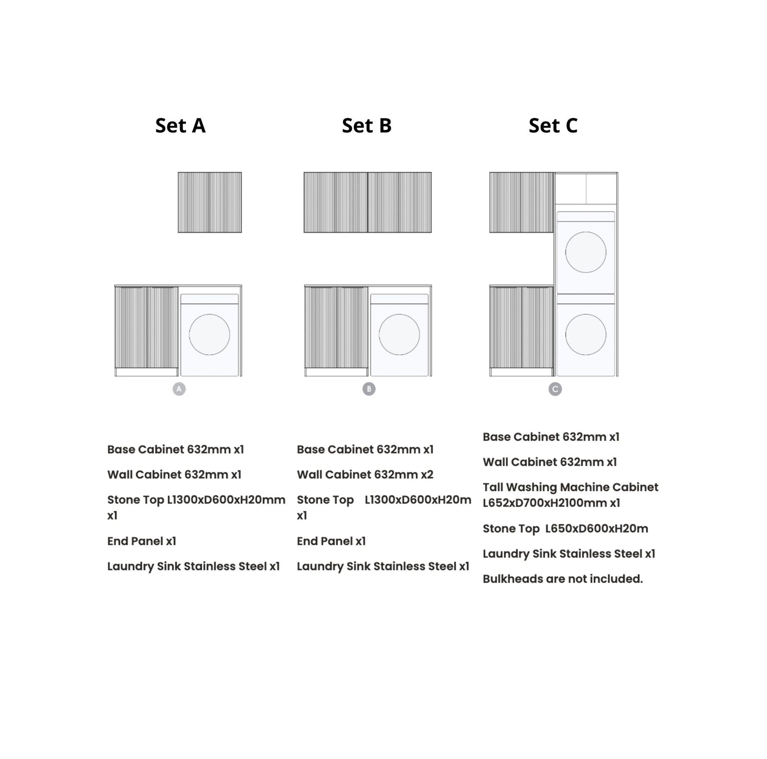 Set C includes a 632mm base cabinet, 632mm wall cabinet, a tall cabinet (L652 x D700 x H2100mm), and a 650mm stone top with a pre-cut for the included stainless steel sink.