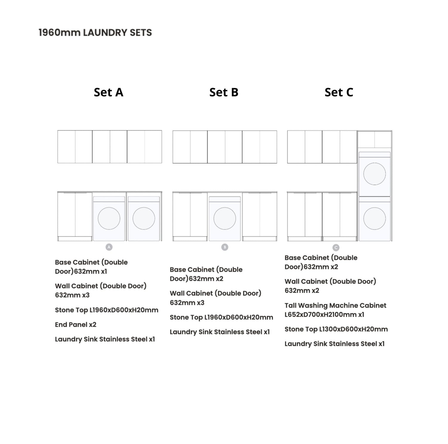 Set C is perfect for laundry areas that need vertical storage or appliance housing. It includes two double-door base cabinets, two double-door wall cabinets, a tall washing machine cabinet, a 1300mm quartz stone top, and a stainless steel sink.