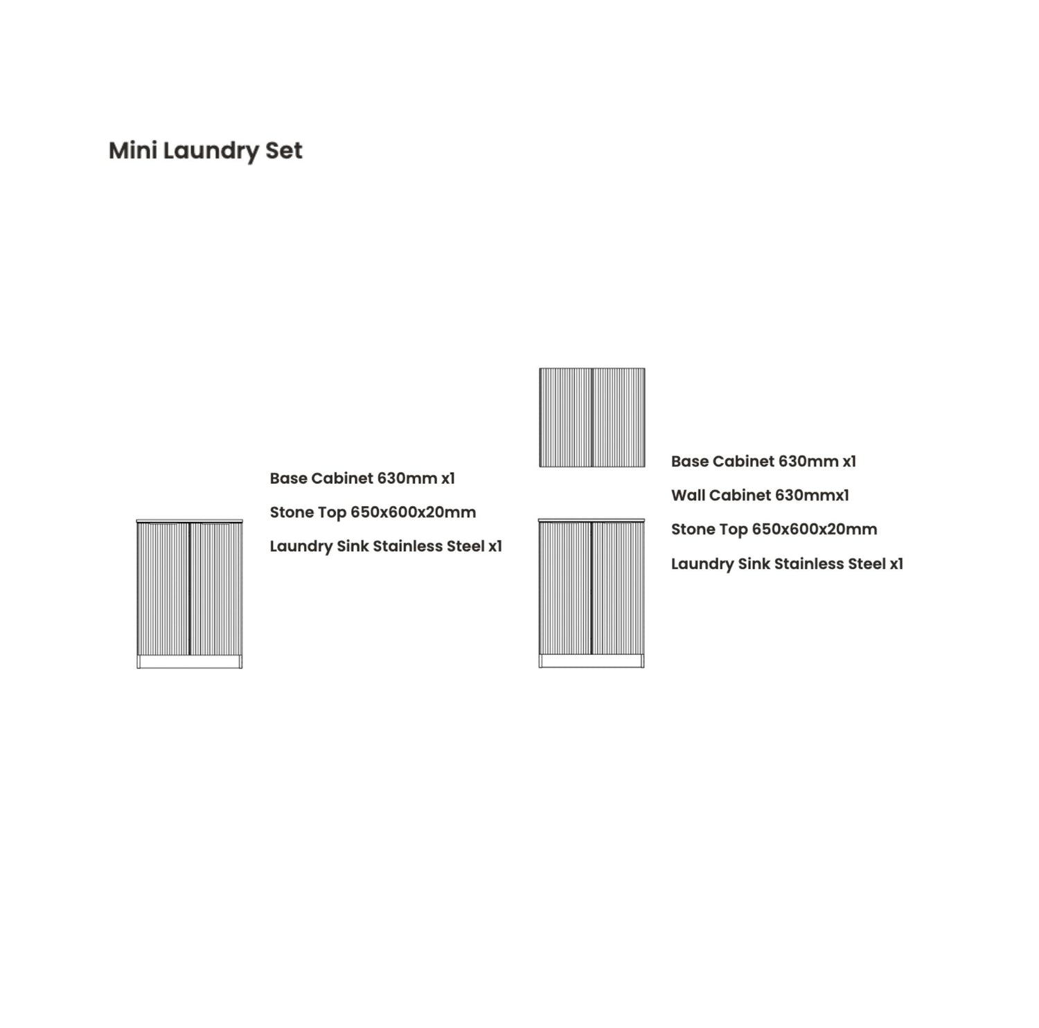 Havana Sable Walnut Laundry Cabinet is a compact and stylish solution for small laundry spaces. Finished in moisture-resistant fluted Sable Walnut, this set includes a 630mm base cabinet, 650mm stone top with sink cutout, and a stainless steel sink.