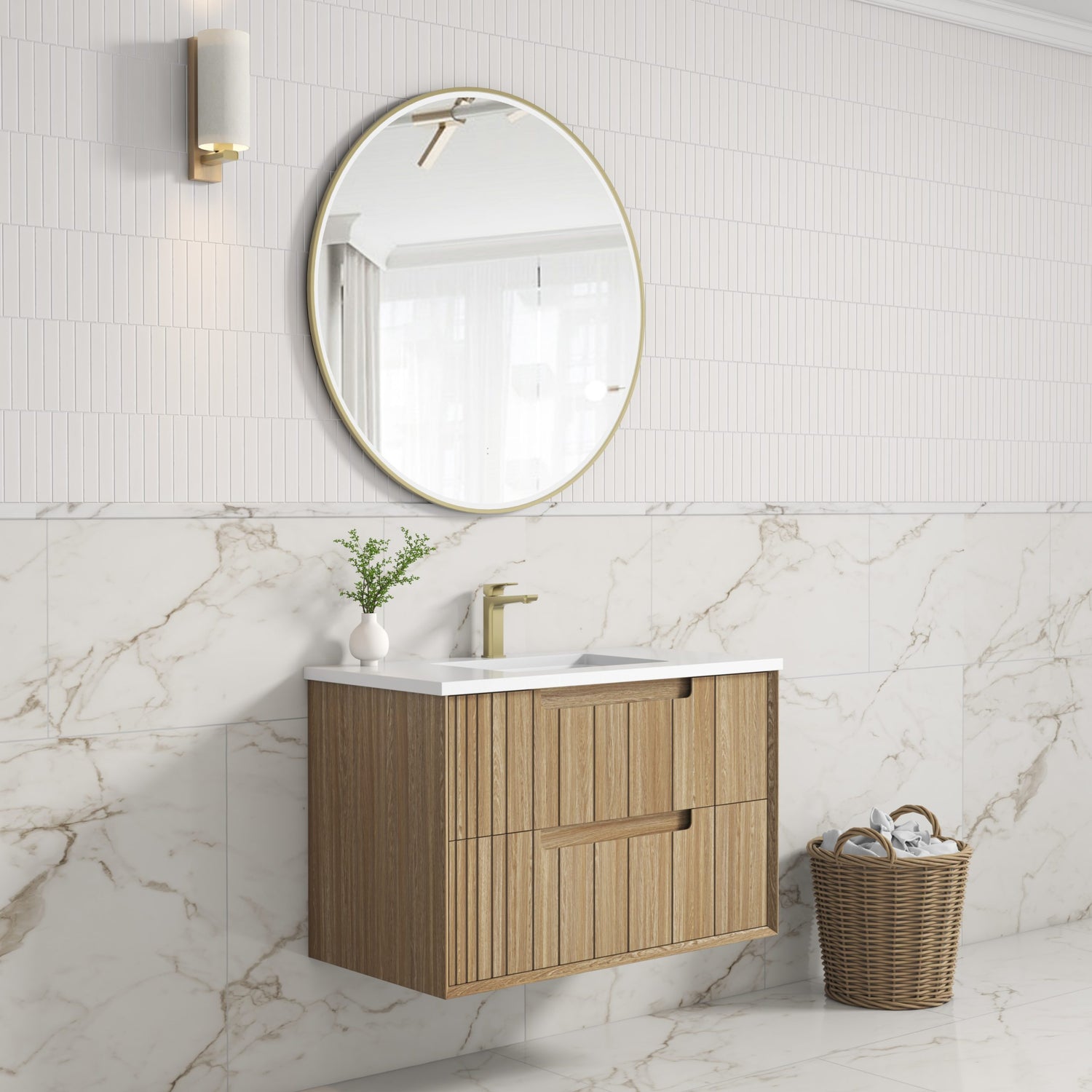 The Voulari 900mm Wall Hung Vanity in Harvest Oak brings effortless style and natural warmth to modern interiors. Expertly crafted from premium-grade timber plywood, it features a sleek framed minimal groove design that enhances the rich oak grain beneath a durable laminate finish. The bevel edge detailing offers a refined touch, while Hettich Quadro S full-extension, soft-close runners provide smooth and quiet functionality. With premium graphite interiors and integrated drawer organisers, this vanity delivers a perfect blend of clean design, quality craftsmanship, and everyday practicality.